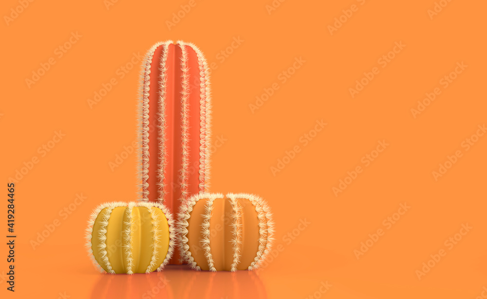 Abstract concept on the topic of the male penis. Three different cacti with thorns on a bright colored pastel background as a concept of infertility and abstinence. 3d illustration #419284465