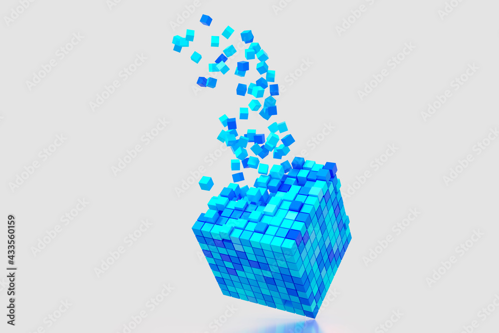 Abstract creative modern blue and white 3D background a three-dimensional cube lying on its side and exploding small cube particles flying out of it. 3d illustration #433560159