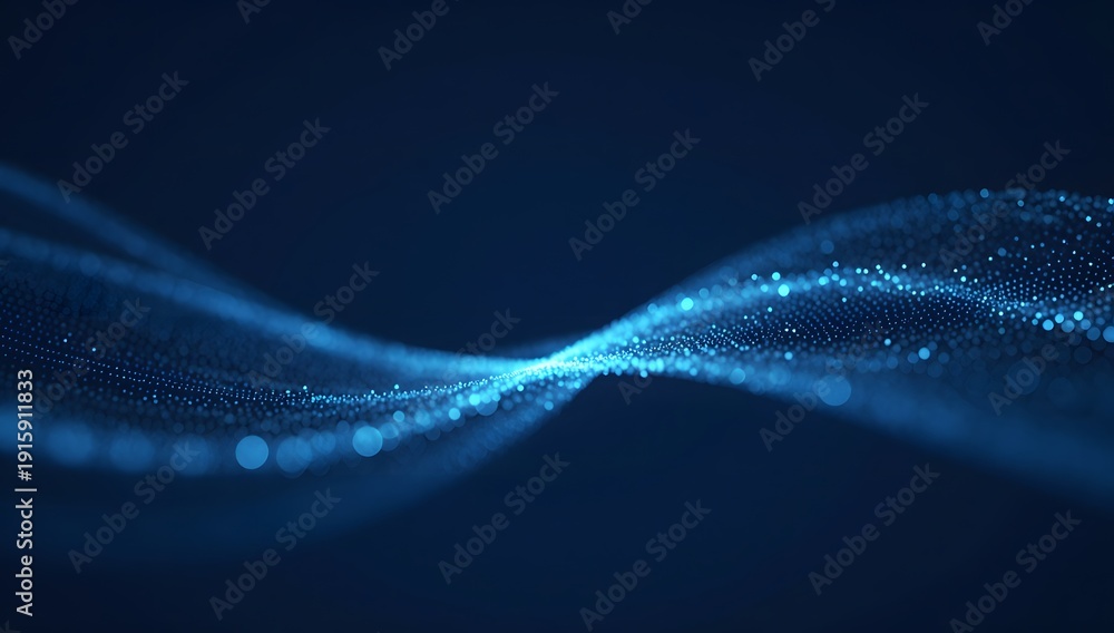 Abstract dark blue background with glowing particles forming wave pattern in center of frame #1915911833