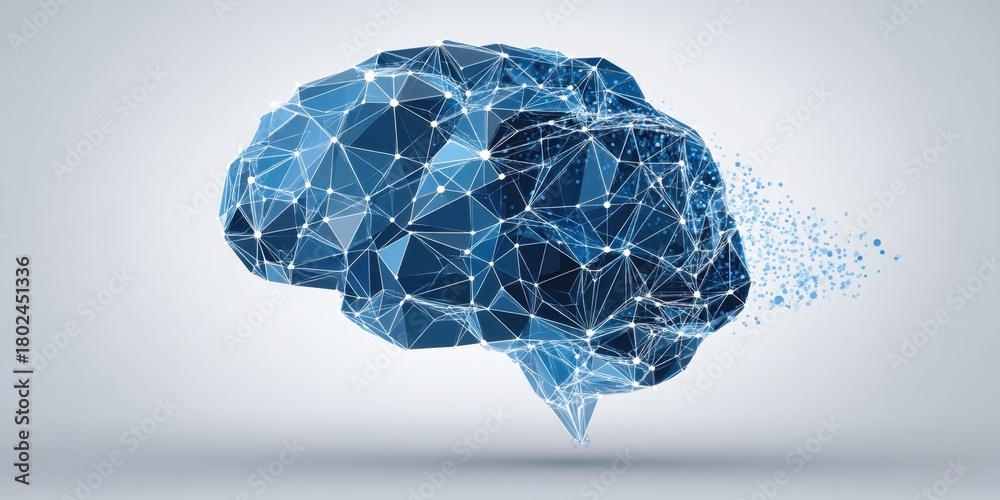 Abstract digital brain illustration composed of interconnected blue polygons and glowing particles, symbolizing artificial intelligence and cognitive technology with copy space #1802451336