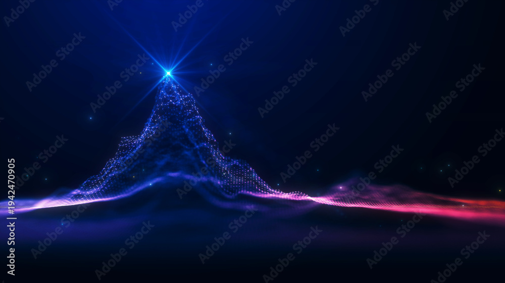 Abstract digital landscape with glowing blue mountain peak and network connection points. Futuristic wireframe terrain represent Big Data and Artificial Intelligence concepts on dark background. #1942470905