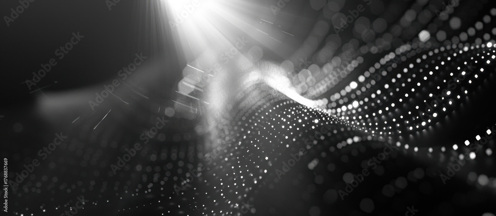 Abstract Digital Wave: An artistic representation of digital data flow, rendered as a captivating wave of luminous particles, illuminated by a celestial light source. #1768837669