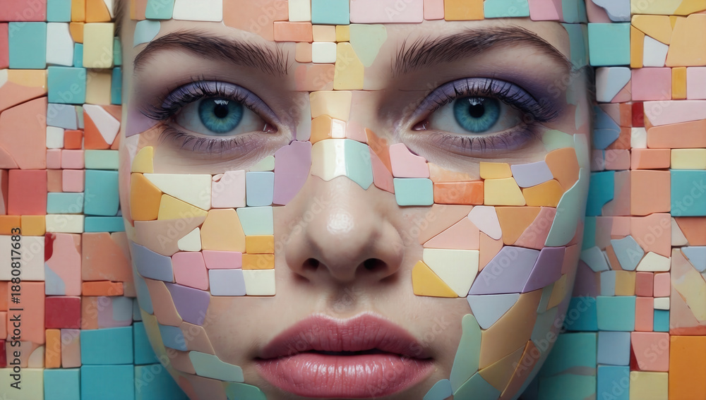 Abstract facial portrait where a woman’s skin transforms into a pastel tile mosaic, merging realism and geometry in a futuristic, artistic, and visually striking image. #1880817683