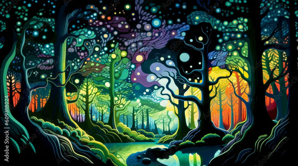 Abstract flat colorful neon light nature forest landscape at night with ink illustration. stars, moon, spooky, fog, galaxy, christmas, halloween. Generative Ai. #609318024