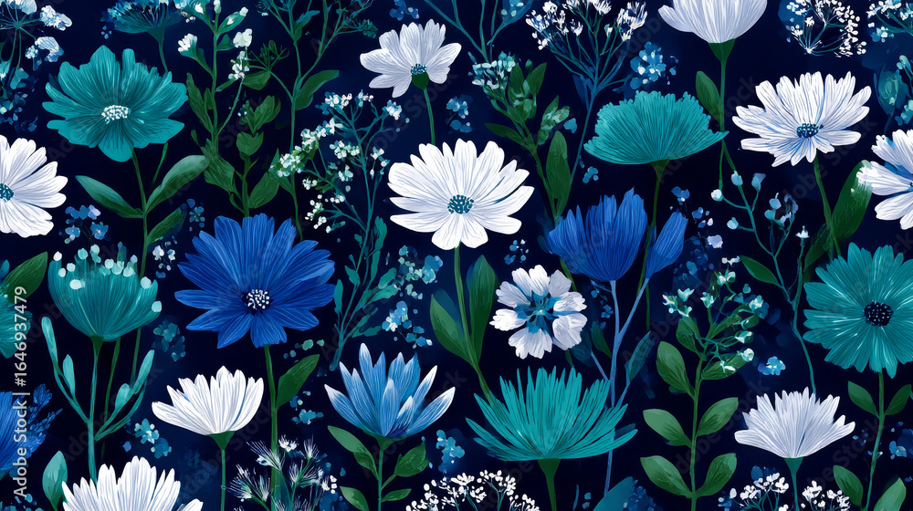 Abstract floral seamless pattern. Colorful botanical print. Cute groovy flowers on a blue background. Blue, white and green colors. Vector illustration #1646937479