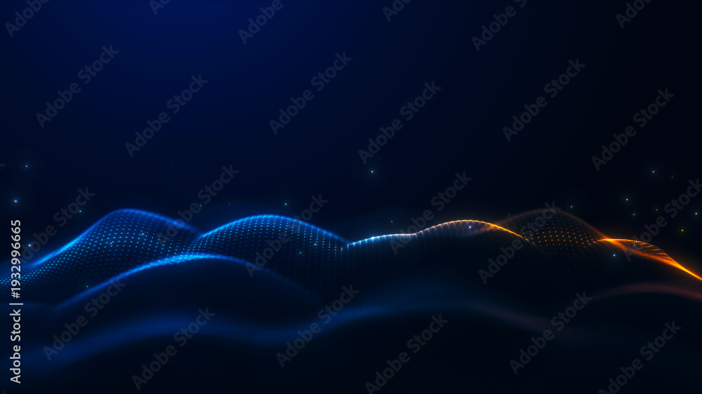 Abstract glowing wave formed by blue and orange particles on a dark background, symbolizing digital data flow, technology, and futuristic innovation. #1932996665
