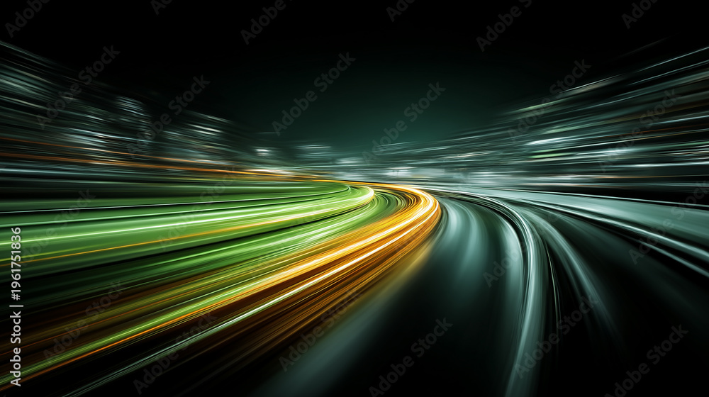 Abstract high speed light trails on curved road at night, dynamic motion and acceleration concept, futuristic transportation and energy flow background #1961751836