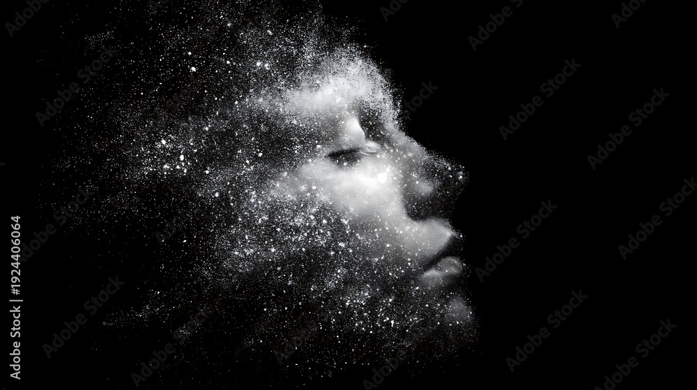 abstract human head dissolving into dust and glowing particles in black space, representing mental emptiness, surreal fine art, detailed particles, #1924406064