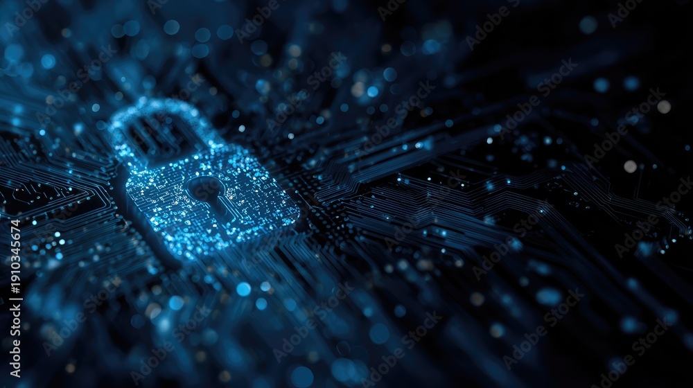 Abstract illustration of a digital padlock symbolizing cybersecurity, data protection, and encryption over a dark background with glowing particles and circuit lines. #1910345674