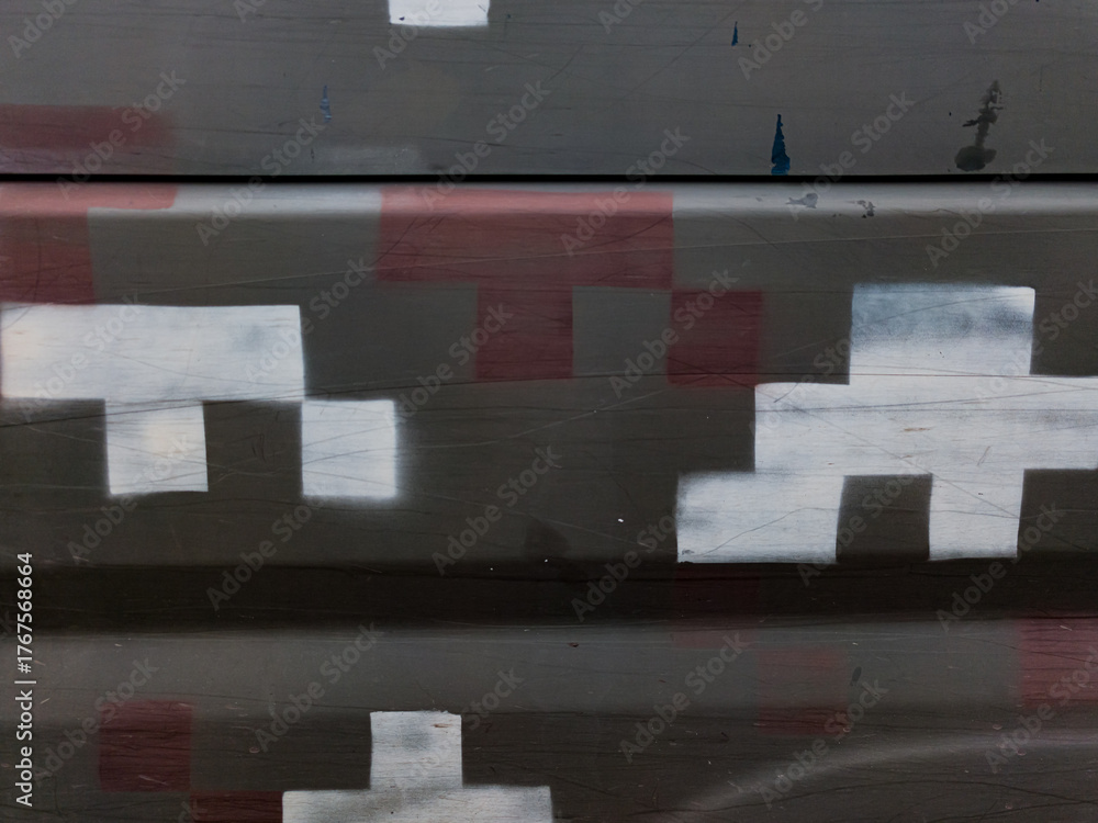 Abstract industrial camouflage pattern on dark metal, featuring pixelated white and faded red blocks, creating a modern, urban grunge texture with subtle reflections. #1767568664