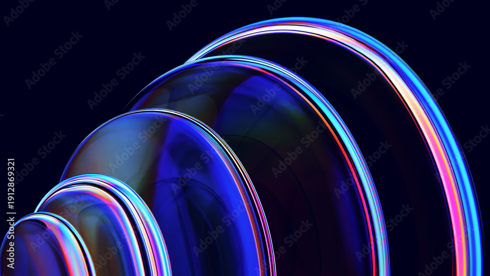 Abstract iridescent glass rings rippling with light dispersion and reflection on a black background #1912869321