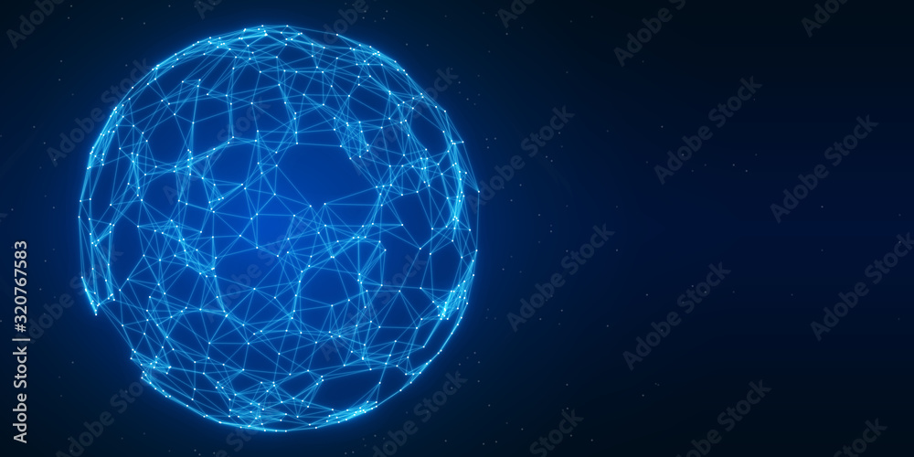 Abstract low-poly technology background of global telecommunication network connection for Internet of Things (IoT), big data science, fintech or Artificial Intelligence (AI), 3D connected sphere #320767583