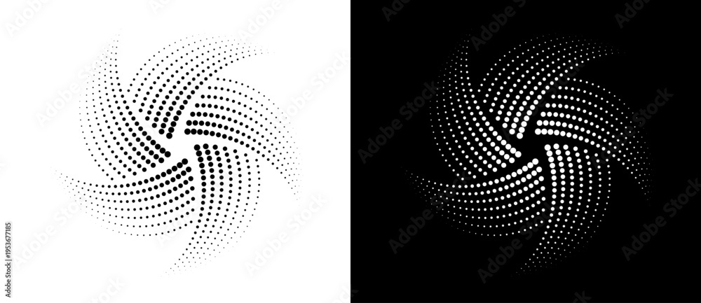 Abstract monochrome halftone dotted spiral vortex with five curved arms. Modern vector radial design on white and black backgrounds for logo, loading icon, tech branding or optical art. #1953677185