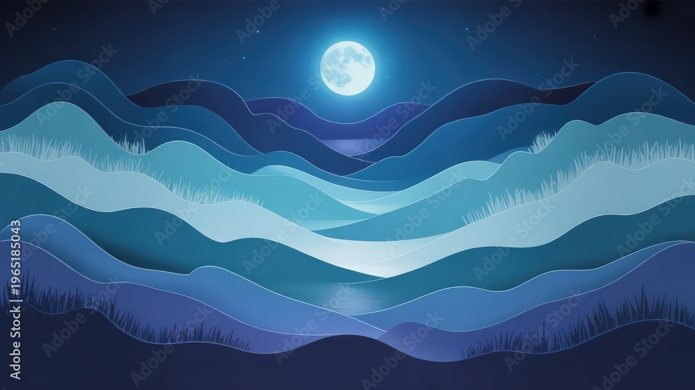 Abstract moonlit night landscape with layered mountains and full moon #1965185043