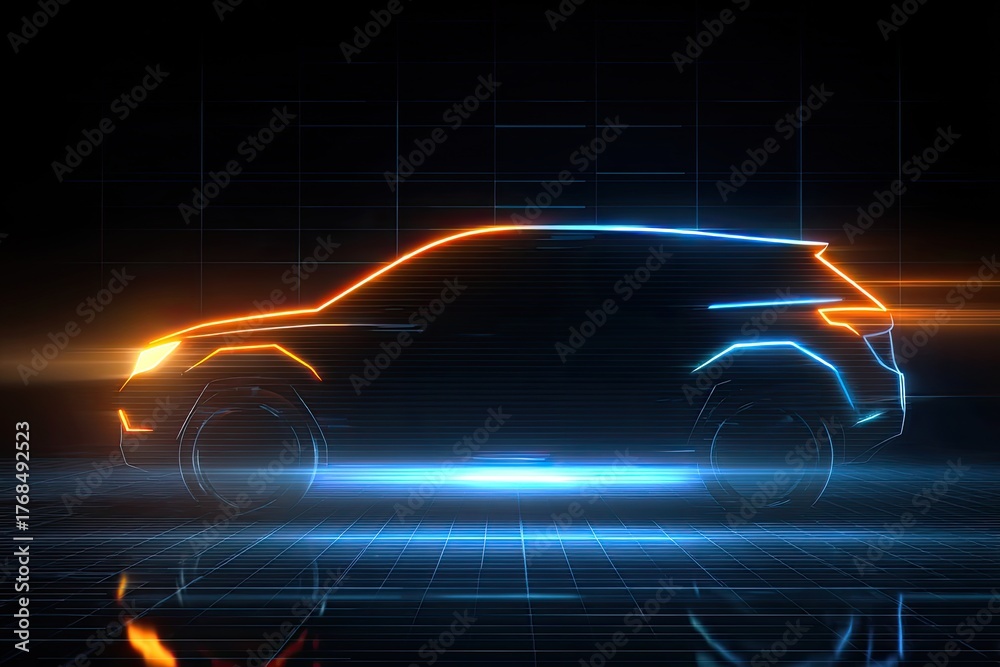 Abstract neon outline of a modern crossover vehicle on dark grid #1768492523