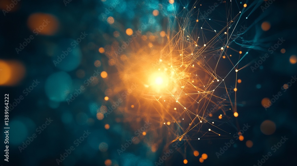 Abstract network with glowing center and connected lines on a dark teal and orange background #1389164222