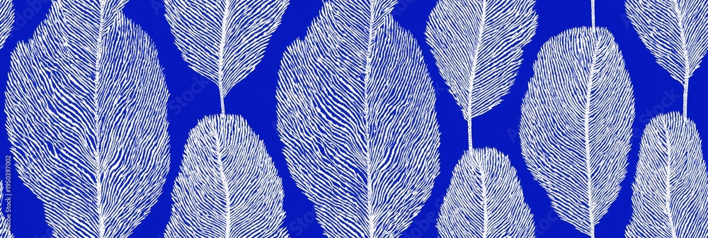 Abstract palm leaf pattern drawing inspired by Suri art. Repeating blue palm leaves with white lines creating a seamless organic pattern #1950397002