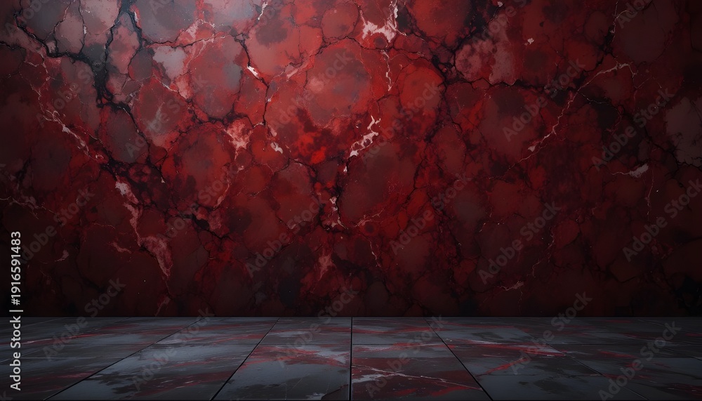 Abstract red marble on black background with dark grunge texture, featuring gray and red granite tile floor, creating a gloomy, moody atmosphere #1916591483
