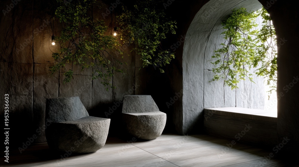 abstract room design, modernist room with levitating stone chairs surrounding twisted lighting vines, facing color-coordinated archways in surreal setting #1957536603