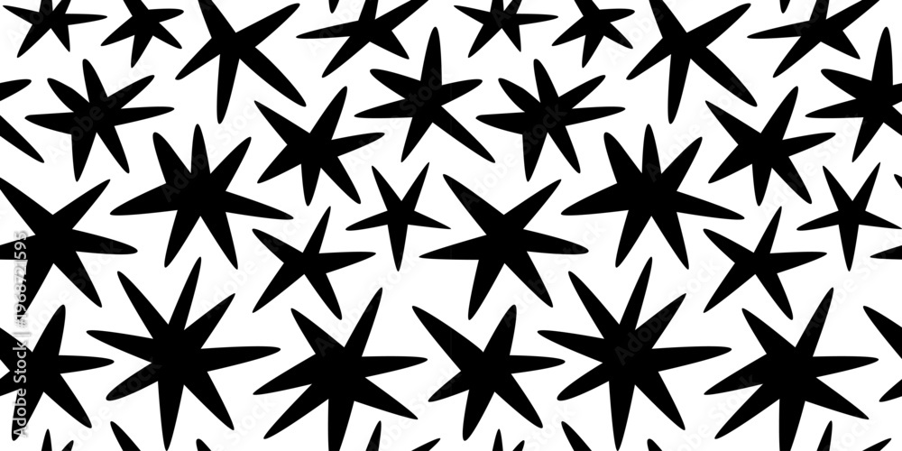 Abstract star shape seamless pattern with black and white geometric doodles. Flat organic cartoon background, simple random shapes print texture. #1968721595