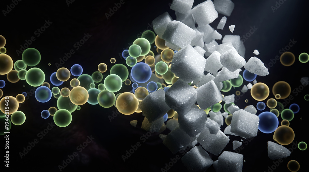 Abstract sugar cubes and colorful molecules healthy nutrition metabolism energy vibrant scientific conceptual dynamic glowing closeup #1946315468