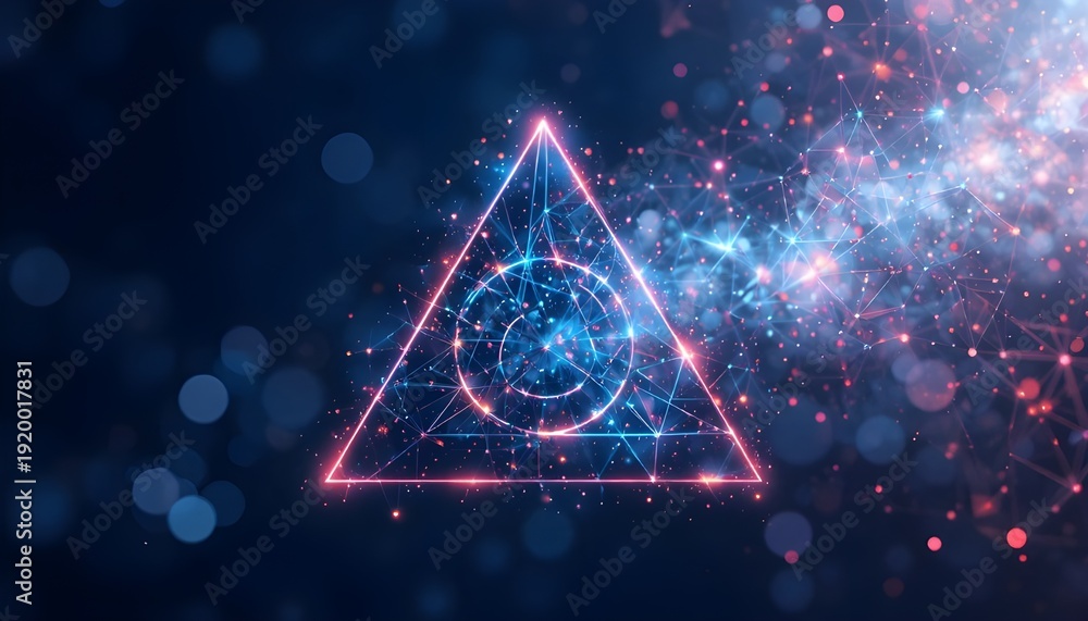 Abstract Technology Poster with Dynamic Triangles, Particle Mist, and Cybersecurity Network Vector Background #1920017831