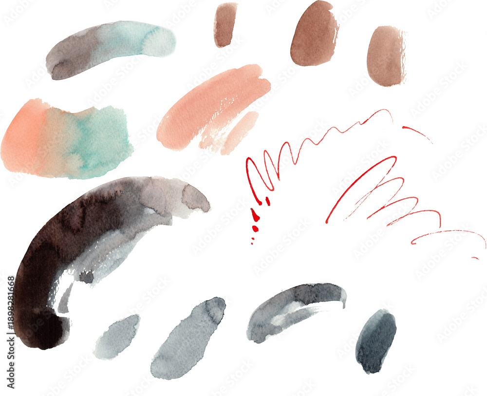 Abstract watercolor painting brushes set in various pastel colors and red lines. Hand drawn splash for creative graphic design on transparent background. #1898281668