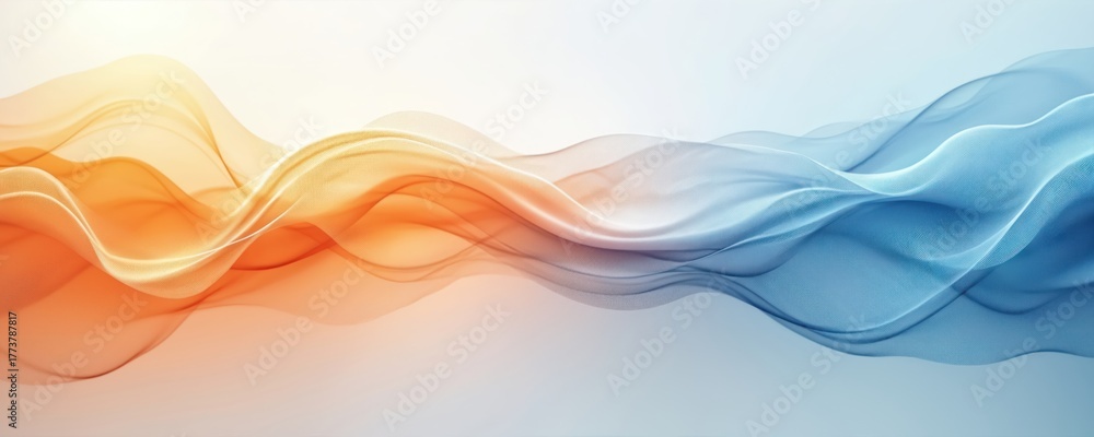 Abstract wavy lines show fluid motion on bright white background. Warm orange, yellow hues blend into cool blue tones, hot to cold. Graphic illustrates air flow, temp regulation, energy transfer, #1773787817
