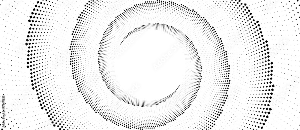 Abstract wide spiral halftone pattern with geometric diamond shapes. Minimalist vector illustration of swirling digital flow or cosmic vortex isolated on white background. #1958671823