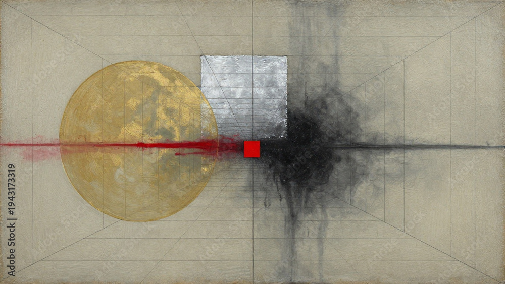 Abstrakter Hintergrund mit Quadraten, Linien und Formen in Gold, Rot und Schwarz #1943173319
