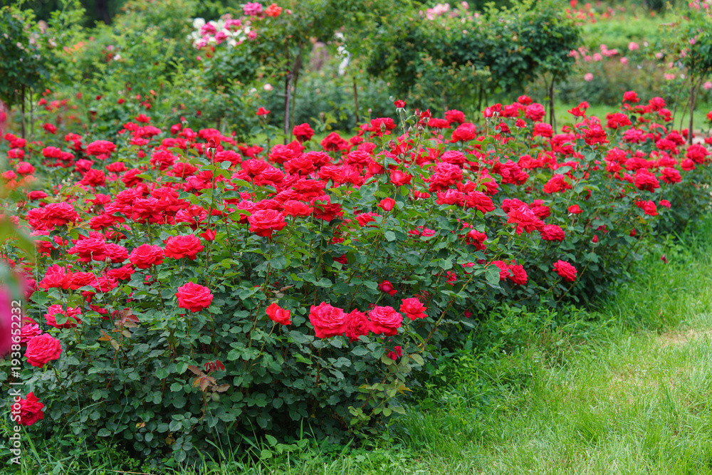 Abundant rose bushes covered with vivid red flowers growing in row along garden path. Dense green foliage and blooming plants in public park or botanical garden on summer background. Plant breeding #1938652232