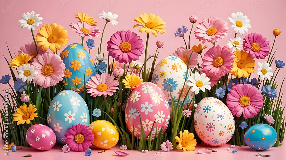 Abundant spring flowers bloom around decorative painted Easter eggs arranged in a lively scene with grass and soft pink backdrop for festive greetings #1953949785