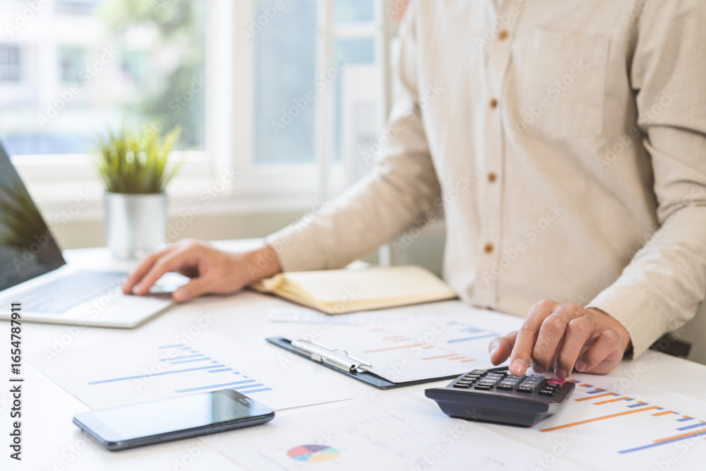 Account finance, asian young business man hand using calculator, laptop computer for calculate budget, cost and income of company from paperwork, plan spend money expenses, working on desk at home. #1654787911