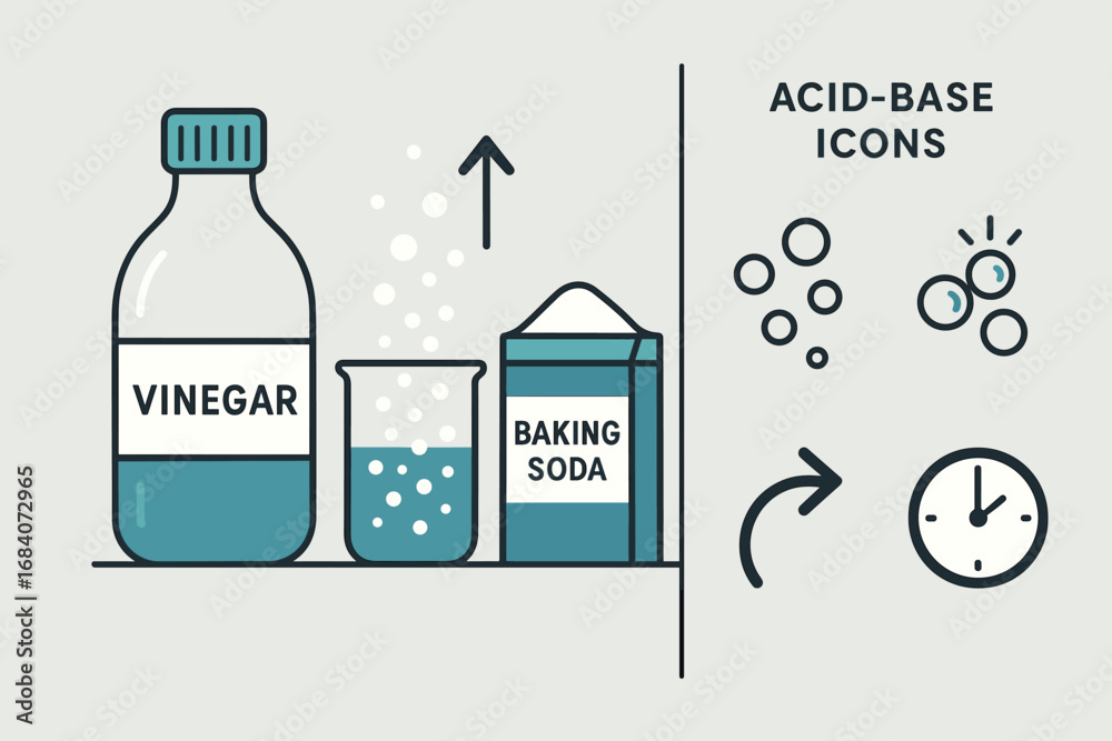 Acid-Base Reaction Icons. Modern vector panel showing vinegar and baking soda test and acid-base icon set for bubbles, fizz, arrow #1684072965