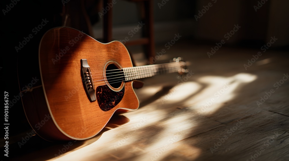 Acoustic guitar resting on wooden floor with sunlight and shadows creating a beautiful scene. #1901856757