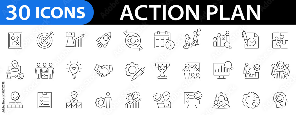 Action plan 30 icon set. Planning, implementation, schedule, collaboration, strategy, analysis, check and more. Editable stroke. Vector illustration #1916710791