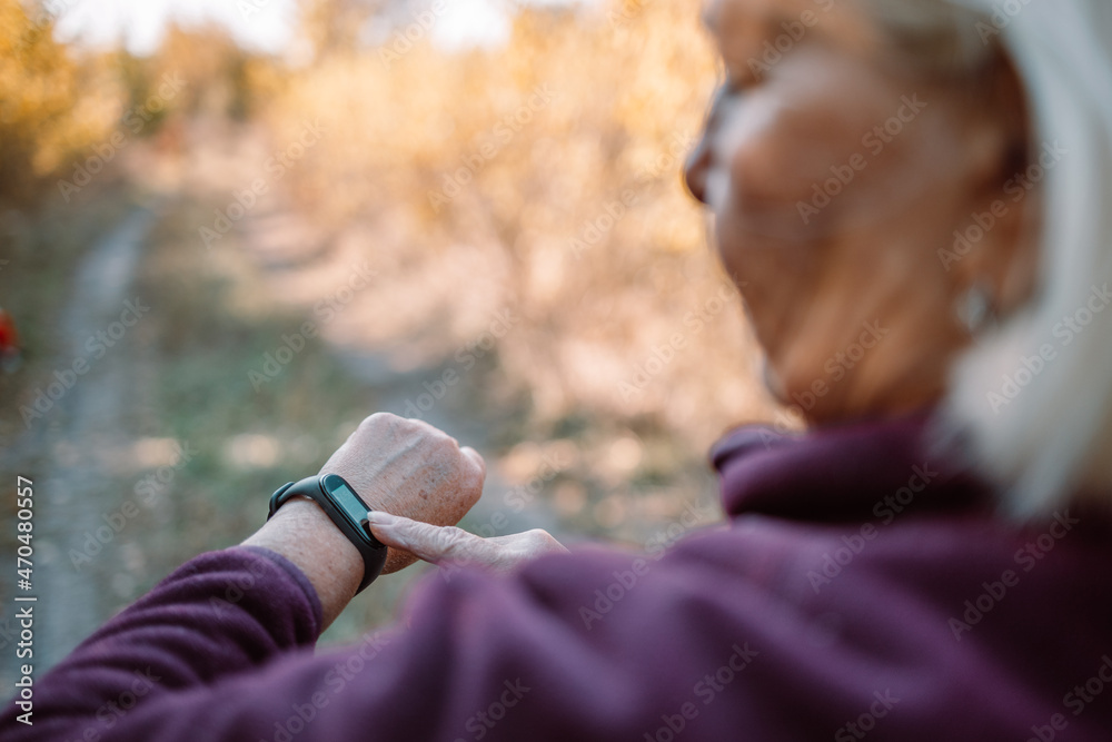 Active sport young runner checking heart rate after run outdoors in city autumn park. Healthy lifestyle concept. #470480557