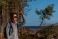 Active woman hiker in a pine forest, shielding her eyes while looking out to the sea under a bright blue sky. Themes: travel, freedom, nordic nature #1790426019
