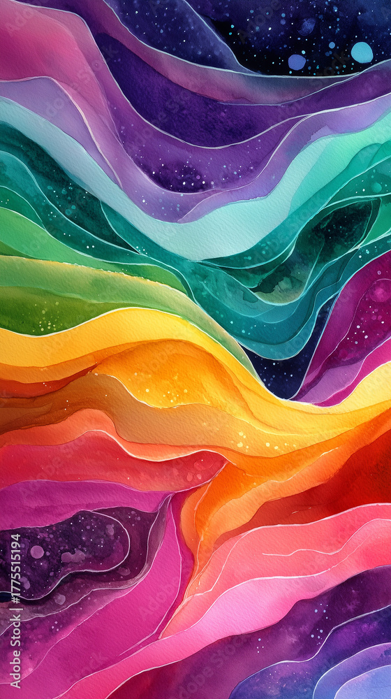 Acuarela abstracta con capas onduladas en tonos arcoíris que transmiten energía, profundidad y armonía visual. Ideal para proyectos creativos, arte contemporáneo y diseño emocional. #1775515194