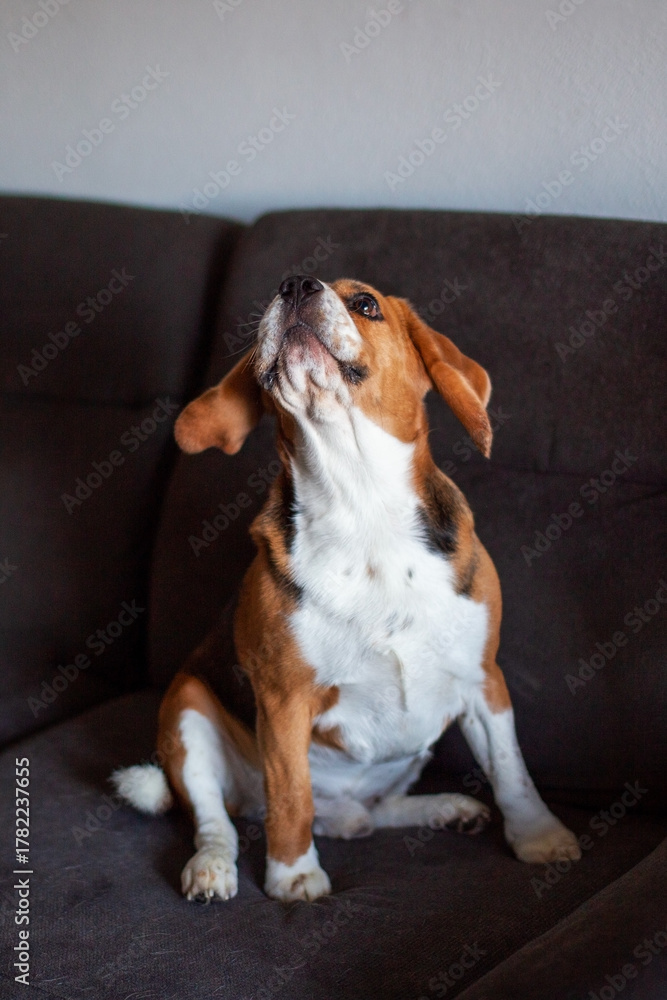 Adorable Beagle Puppy Sitting Attentively on a Couch #1782237655