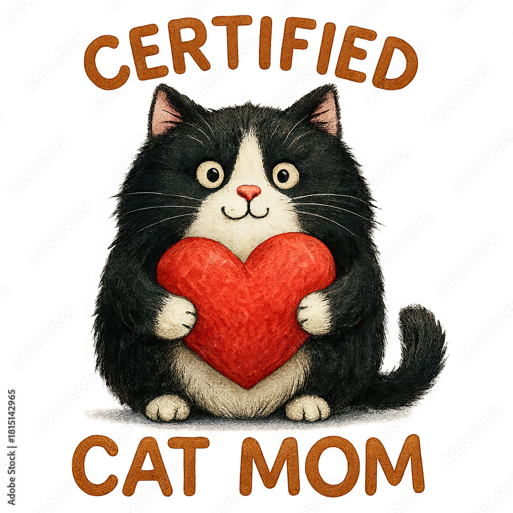 Adorable black-and-white fluffy cat holding red heart with "CERTIFIED CAT MOM" text #1815142965