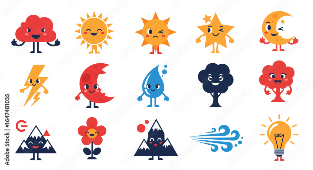 Adorable cartoon natural elements and weather icons with expressive faces illustration set #1647481035