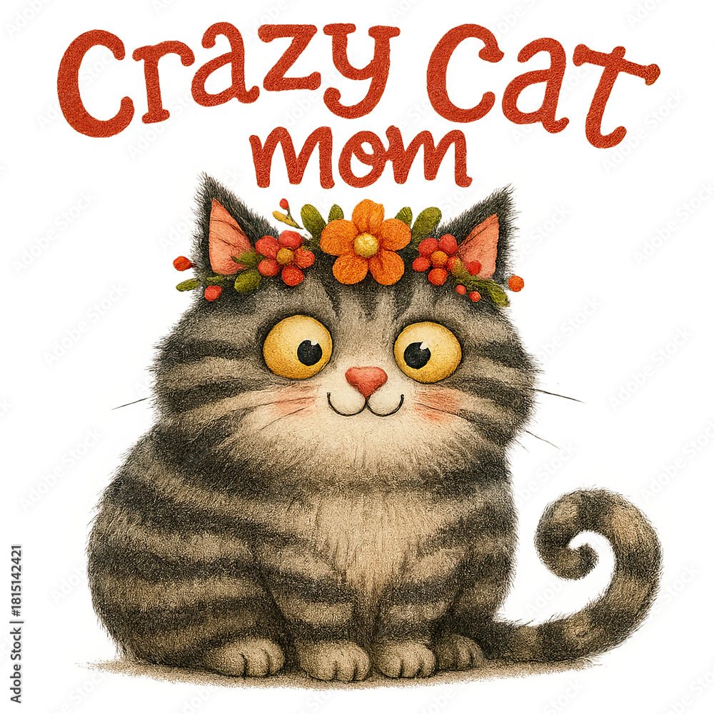 Adorable gray tabby kitten wearing flower crown under playful text "Crazy Cat Mom" #1815142421