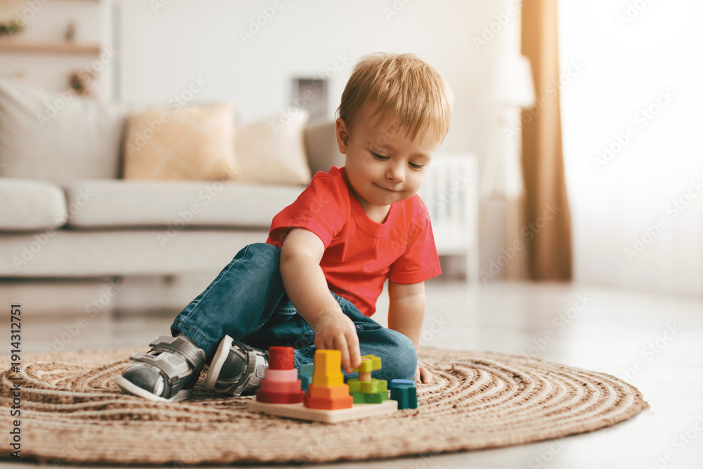 Adorable little boy playing with educational wooden toy at home, sitting on floor carpet in living room interior, copy space. Toddler with wooden colorful stacking and sorting toy. Child development #1914312751