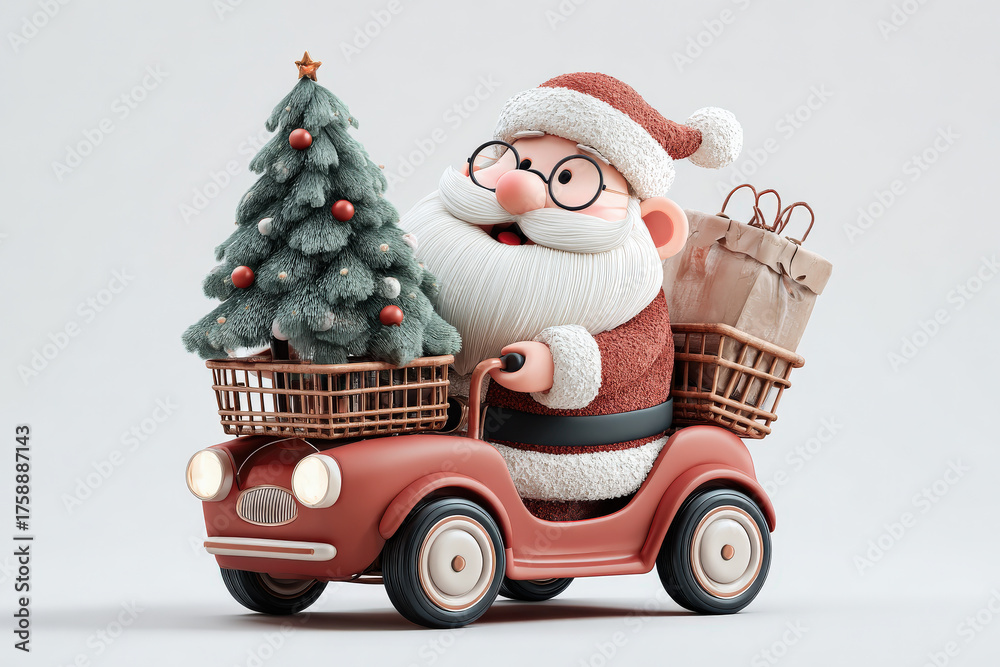 Adorable papa noel de dibujos animados 3d, conduciendo un cochecito rojo con carita sonriente llevando en dos cestas de mimbre un arbol de navidad y bolsas de la compra de crton sobre fondo blanco #1758887143