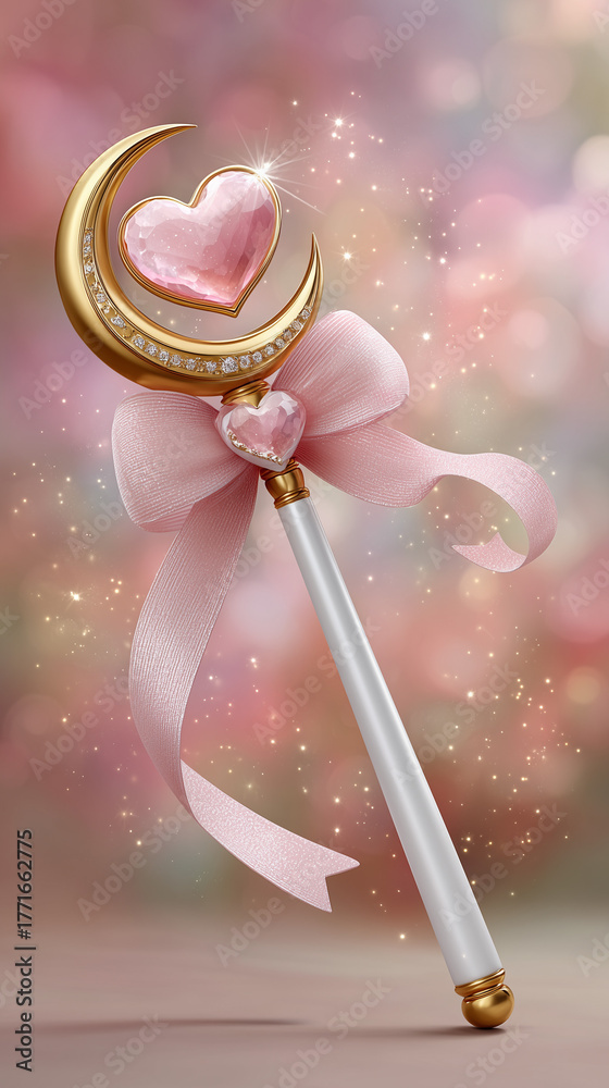 Adorable pastel magical wand featuring a golden crescent moon and pink gemstone crystal with delicate ribbons and glowing sparkles. Soft, dreamy light atmosphere with ethereal fantasy mood — perfect f #1771662775