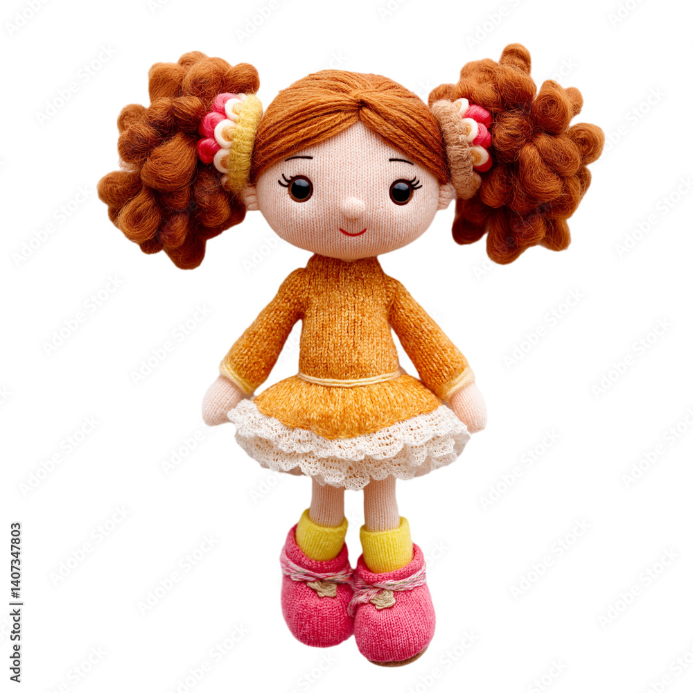 Adorable plush toy doll with brown curly hair isolated on transparent white background #1407347803