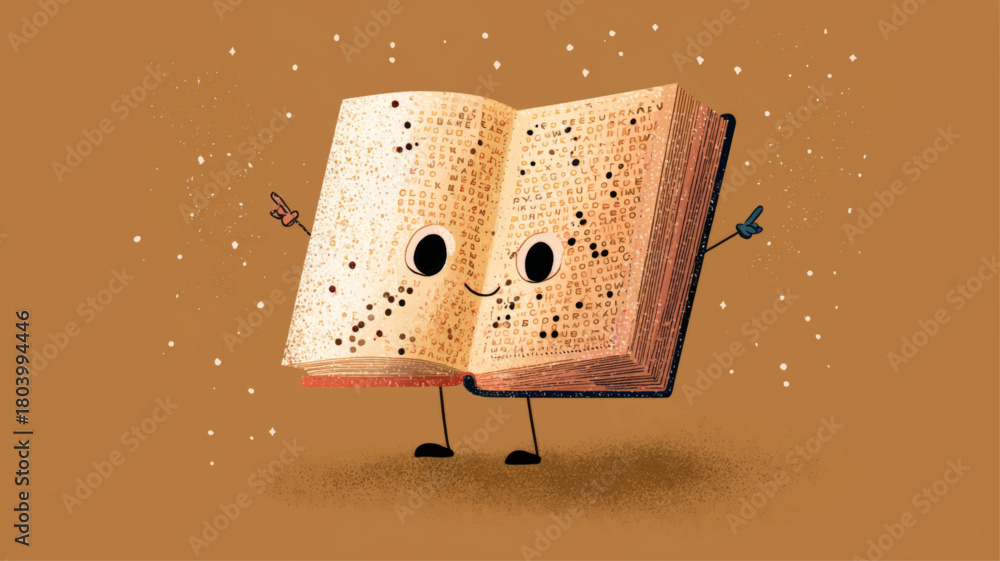 Adorable smiling Braille book character celebrating inclusive reading and tactile literacy on a warm educational background with generous copy space. #1803994446