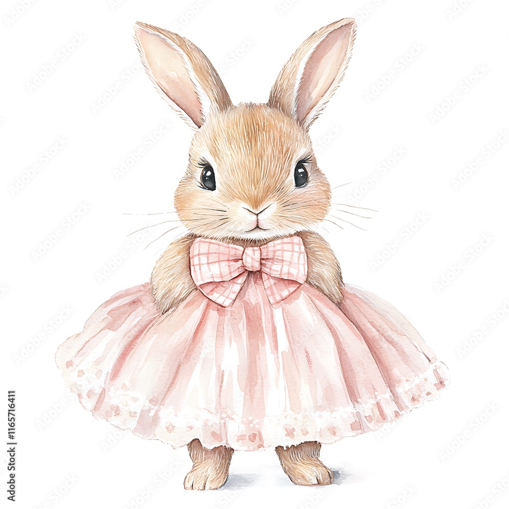 Adorable Watercolor Painting of a Bunny in a Pink Dress and Bow. #1165716411
