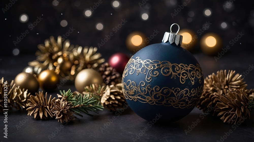 Adorno navideño con bola azul con patrones dorados y bolas doradas con piñas decorativas. Postal Navideña #1105913276